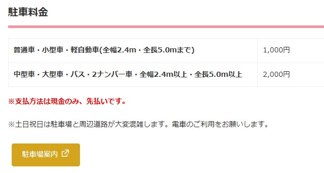 アクセスページと料金ページの両方で、土日祝は駐車場だけでなく周辺道路も大変混雑すると案内されています。