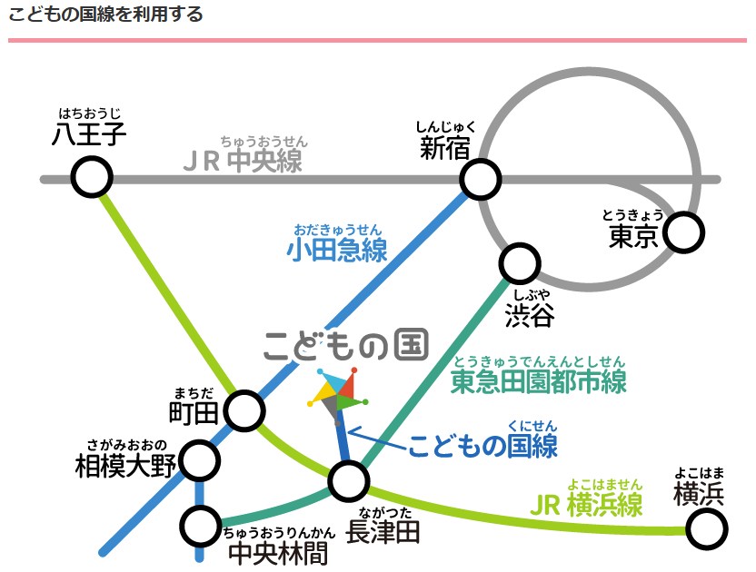 最寄りは「こどもの国駅」で、長津田駅からこどもの国線に乗り換え、駅から正面入口までは約3分です。