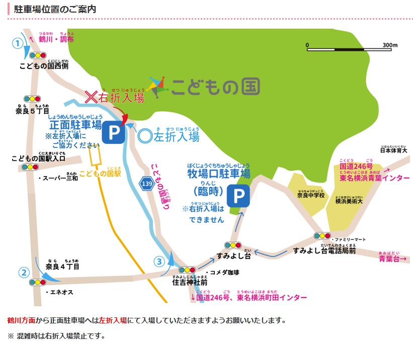 こどもの国の駐車場は、正面駐車場が820台、混雑状況に応じて開場する臨時の牧場口駐車場が700台です。