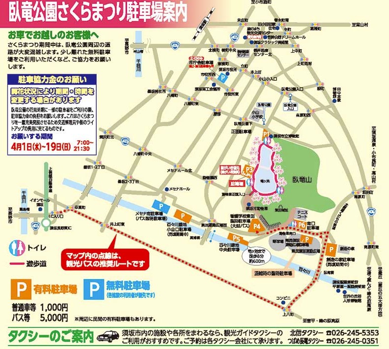公式案内では、有料・協力金対象としてP1(須坂市立博物館前)、P3(池乃清泉亭となり)、P4(看護学校東側臨時)、P5(百々川緑地中央)、P6(南口)などが掲載されています。