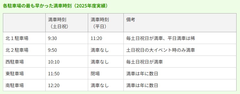 公園公式Q&Aでは、駐車場は「春と秋の連休が最も混雑」と明記されています。