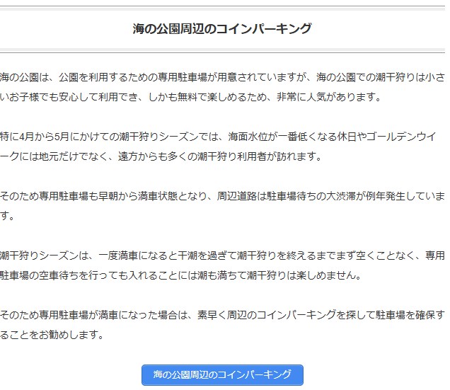 公式HPでは、GWなど潮干狩りシーズンでは、遠方からも多くの利用者が訪れること、周辺道路の駐車場待ち大渋滞が例年発生していること、1度満車になるとまず空くことはないため周辺のコインパーキングの利用を推奨しています。